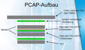 Im Gegensatz zu resistiven Touchscreens, die mittels Kunststoffmembran auf Druck reagieren, sind PCAP-Ausführungen von vorne und hinten mit einer Schutzglasscheibe (Cover Lense) versehen, die gleichzeitig für eine hohe Widerstandskraft und gute optische Darstellung sorgt.